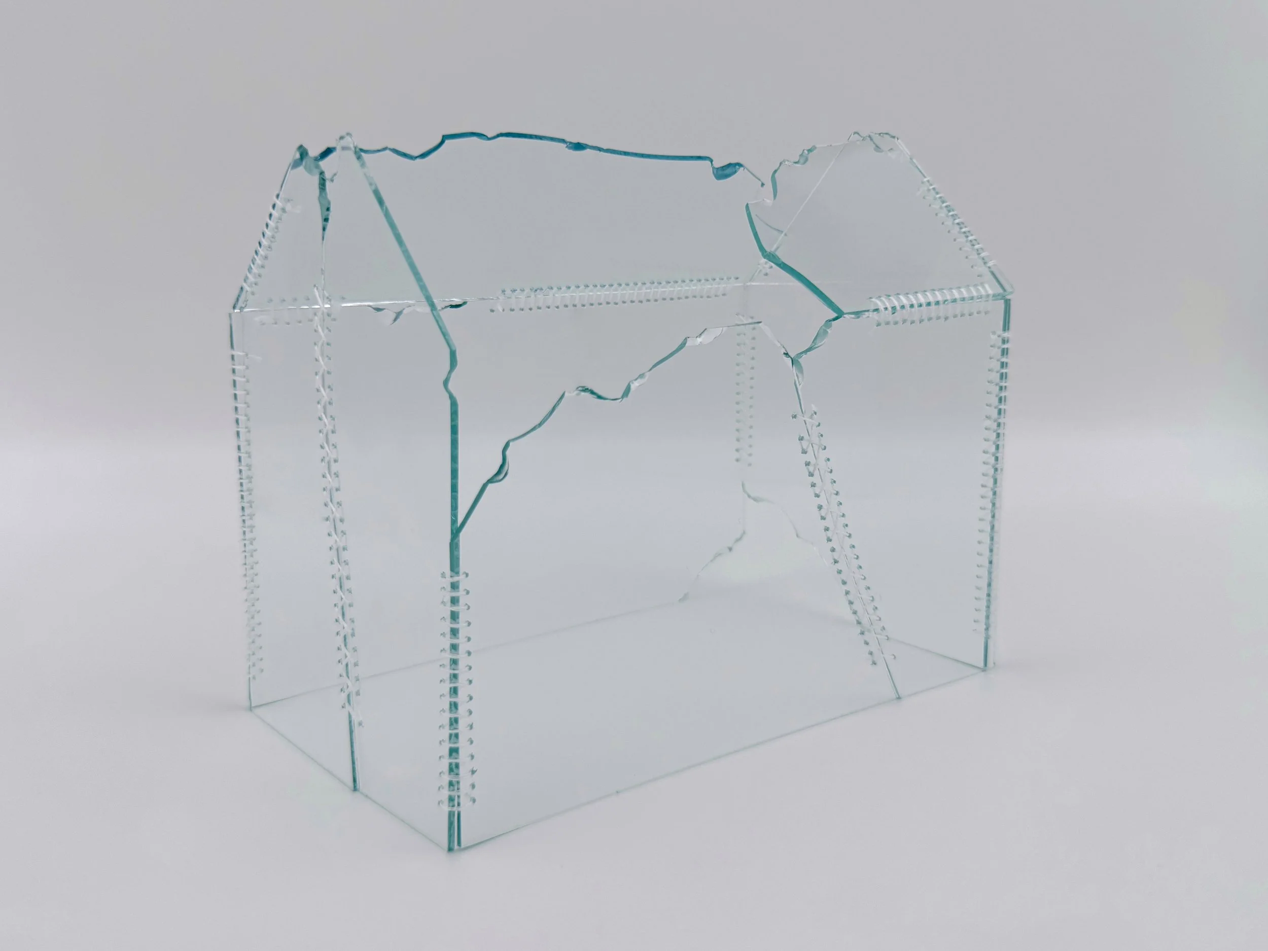 Broken House is a series of sculptural works created from shattered glass structures —houses that have been painstakingly pieced back together and stitched with cotton embroidery thread. The act of mending these fragile forms serves as both a literal and metaphorical gesture: a reflection on the silent, often invisible, labour of women, particularly mothers, who are left to hold together broken systems with tenderness and resilience. These delicate reconstructions mirror the emotional and structural fractures within capitalism. In a system that continues to devalue care work, mothers are often expected to bear the emotional and logistical burdens without recognition or support. We live within a framework we did not choose, repairing the damage with whatever thread we can find—domestic, emotional, maternal.