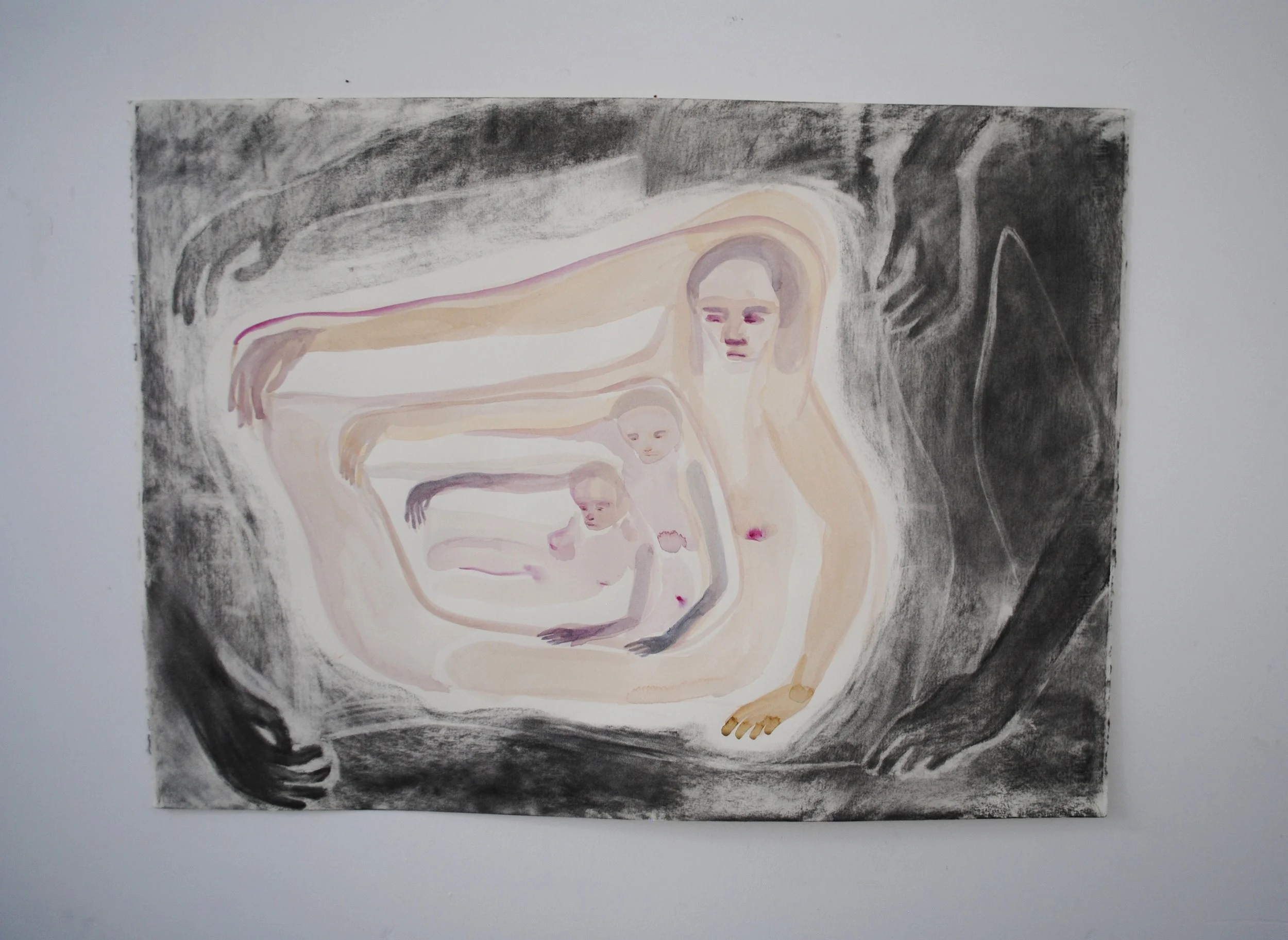 Maria José Carvallo explores in-depth questions about how to inhabit a body and the act of representation that this entails. Her work reflects a process of deconstructing in painting and images the assumptions of gender and motherhood that are rooted in her own culture and catholic imagery. She depicts bodies within the spaces to convey the notion of the body as both tender and foreign. Carvallo has developed an intuitive approach to drawing and painting. She draws inspiration from art history and has devoted considerable attention to representations of women by male art masters, combined with her personal and domestic imagery. She uses watercolour paintings, charcoal, pastels, installations, and mixed media artefacts as an attempt to reflect on the psychological ramifications of the act of living and being attached to others. In her images, she evokes a phantasmagorical, dreamlike world populated by haunting bodies, intertwined forms, halfway between figuration and abstraction. At the centre of her work is the human body, a body that lies, floats, dilutes its boundaries, transforms, erases, becoming a constantly mutating being. With pale tones and loose strokes and shapes, she invites the gaze to safely enter into a seemingly dystopian world, inviting the viewer to consider experiences and feelings that are uncanny, unconscious, strange and inner world.